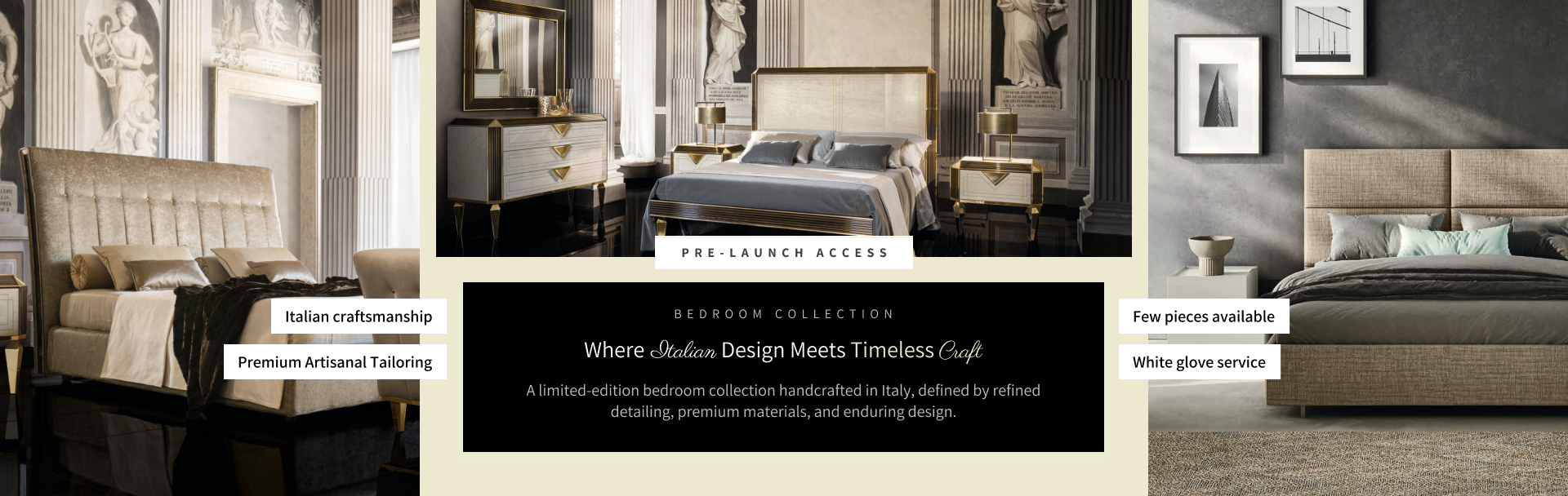 A curated pre-launch selection of Italian bedroom designs, offered at special introductory pricing.