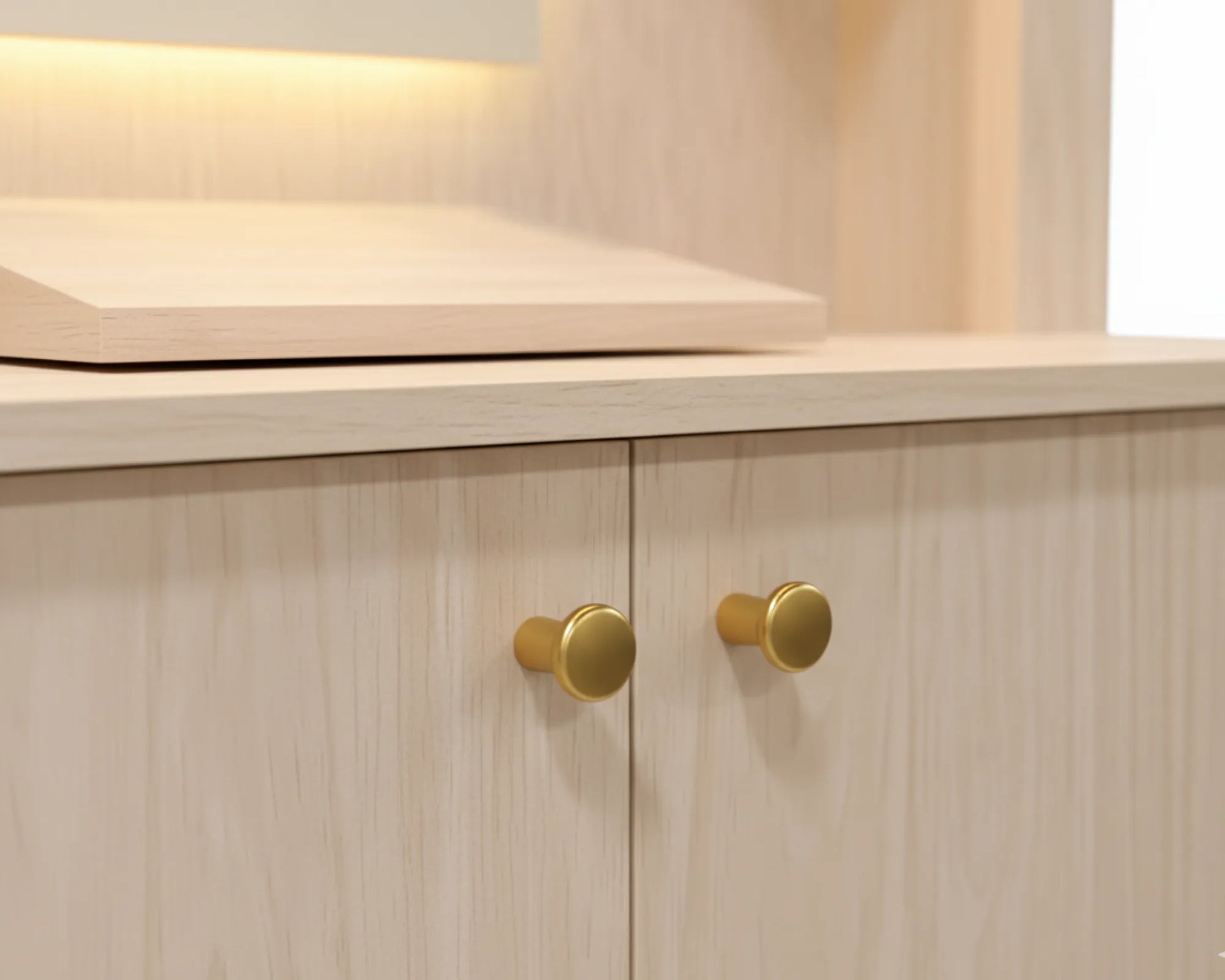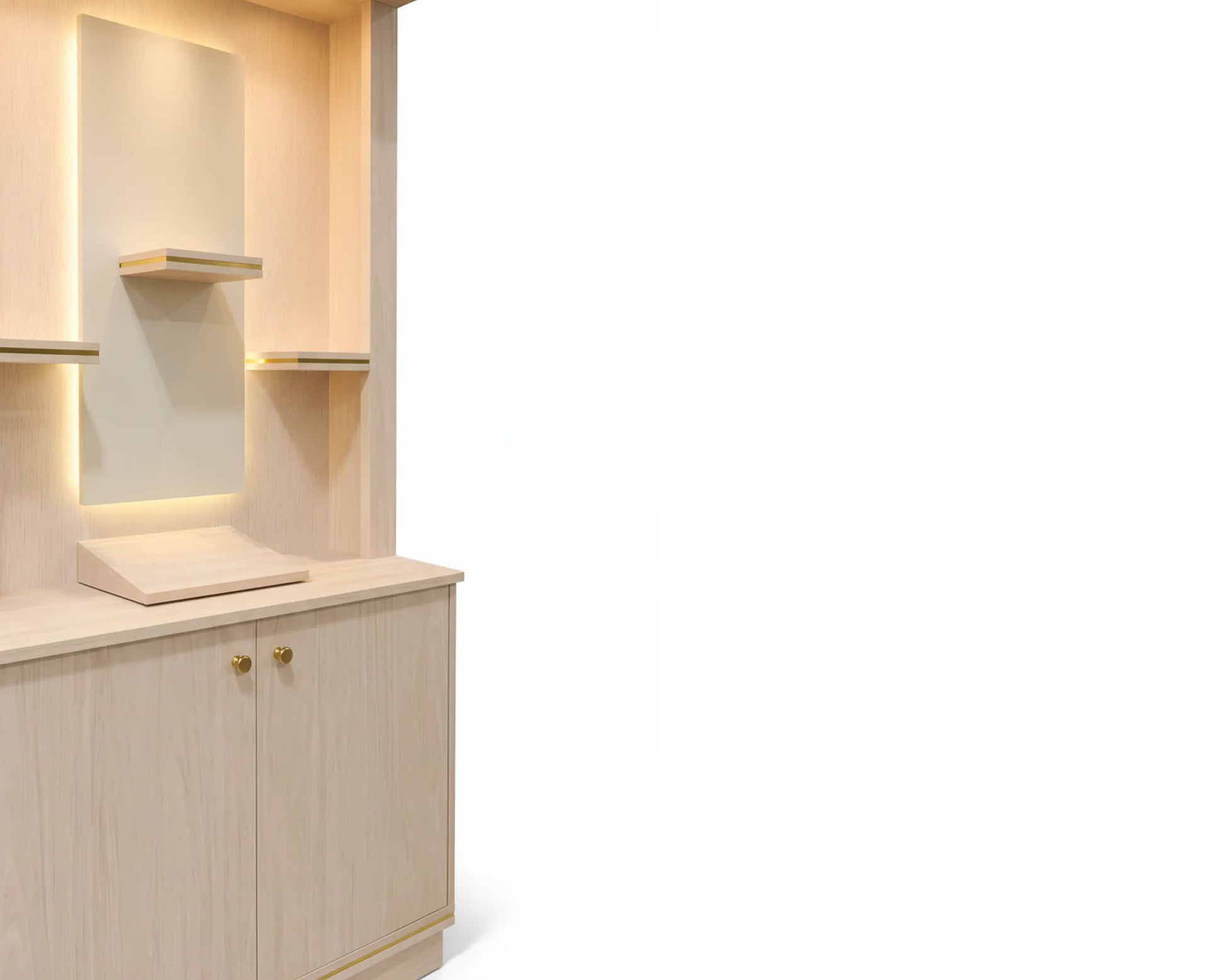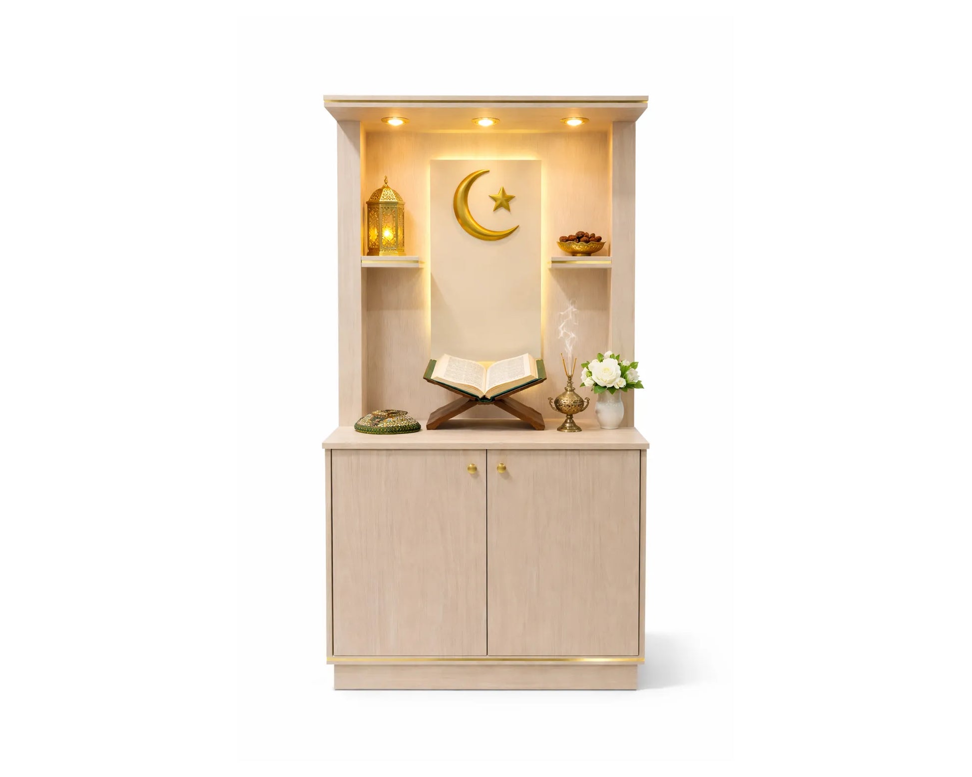 Integrated warm LED spotlights softly illuminate the prayer space, casting a gentle glow that enhances the spiritual atmosphere during morning and evening rituals. The lighting is carefully positioned to provide warmth and clarity without harsh brightness.