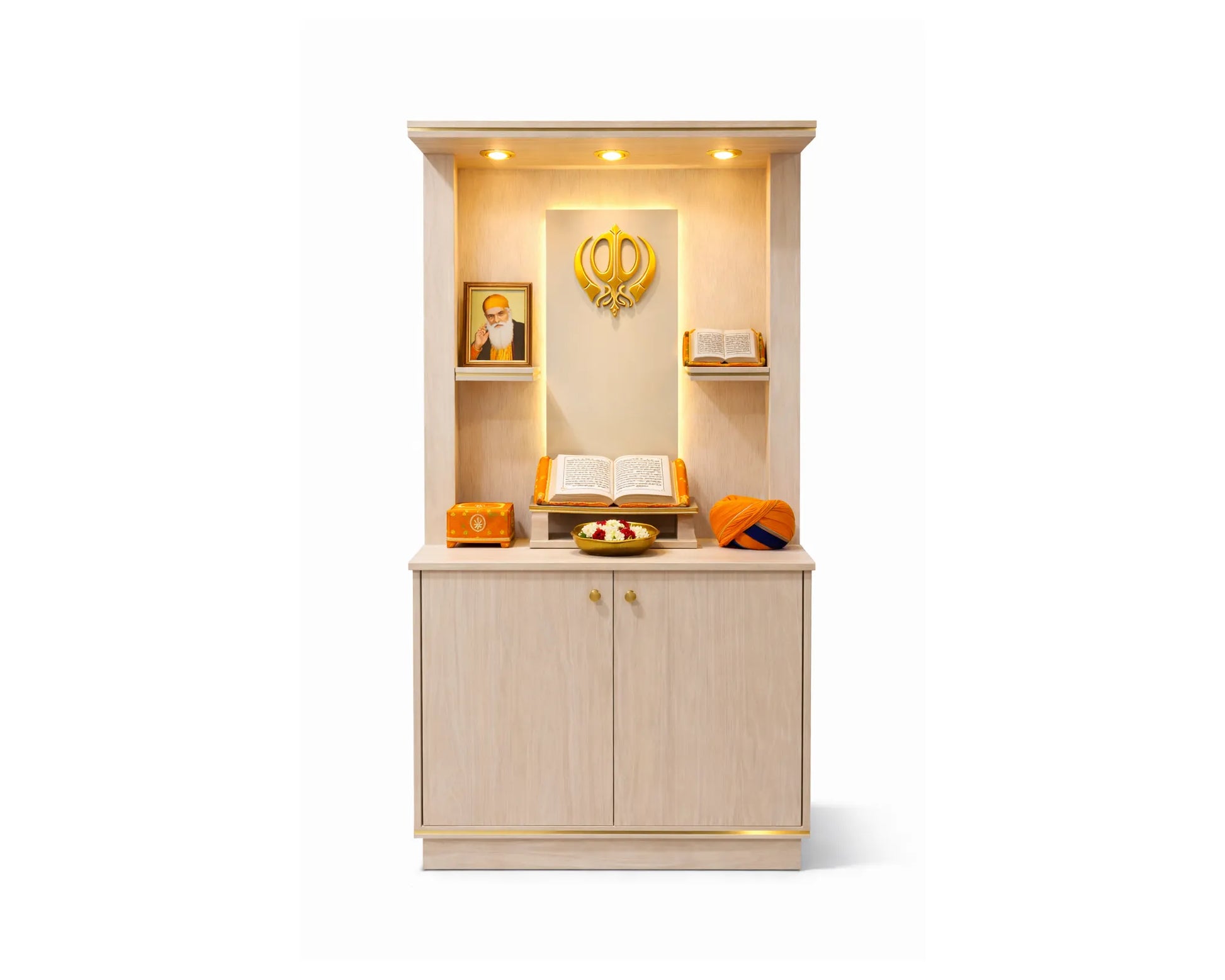 The lower base storage offers convenient concealed space for prayer essentials such as books, incense, cloths, and accessories. This helps maintain a clutter-free environment while keeping everything you need within easy reach.