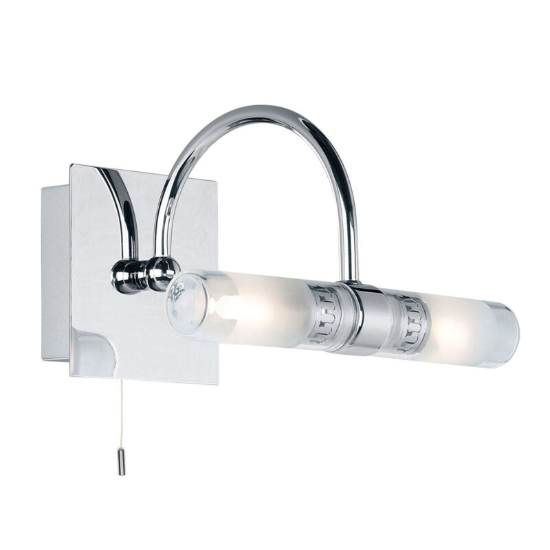 Technical Specifications: This 2 light wall and mirror lamp is designed with polished chrome effect plate and clear, frosted glass shades. IP44 rated with a pull switch to turn the lights on/off. Matching product available