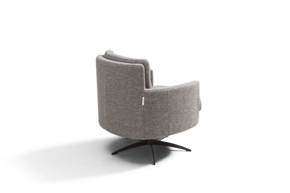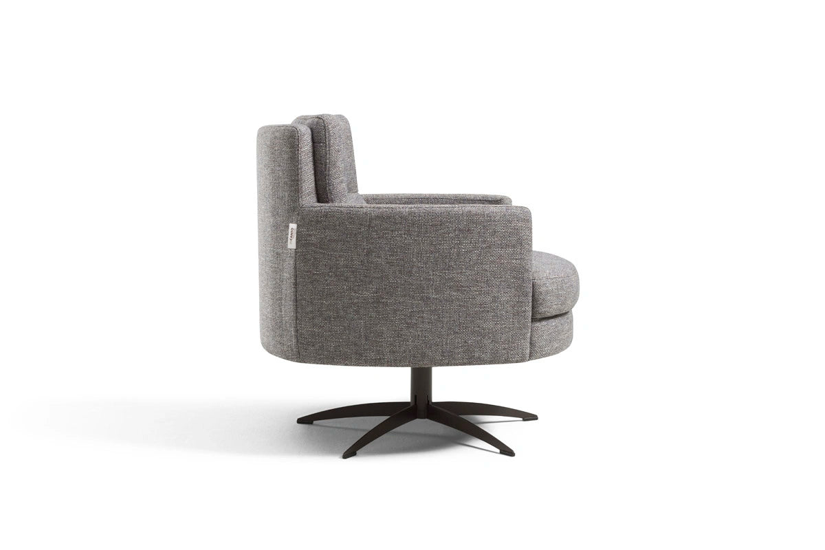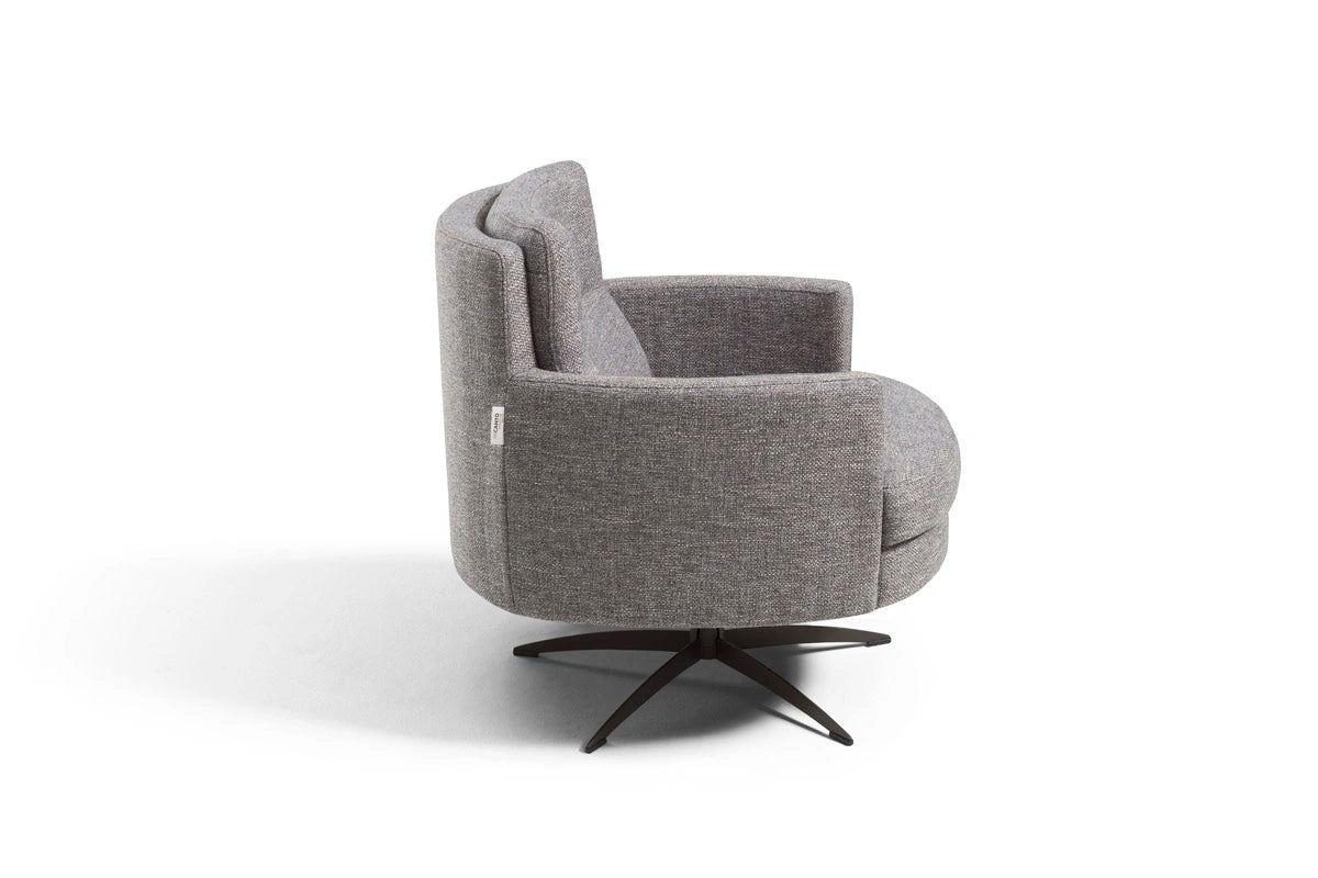 Thea is a sleek, modern swivel armchair featuring a sturdy metal rotating base for smooth 360° movement. Part of an exclusive collection that melds vintage charm with contemporary style, Thea evokes a warm retro atmosphere while fitting seamlessly into modern interiors.