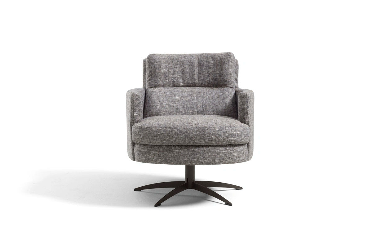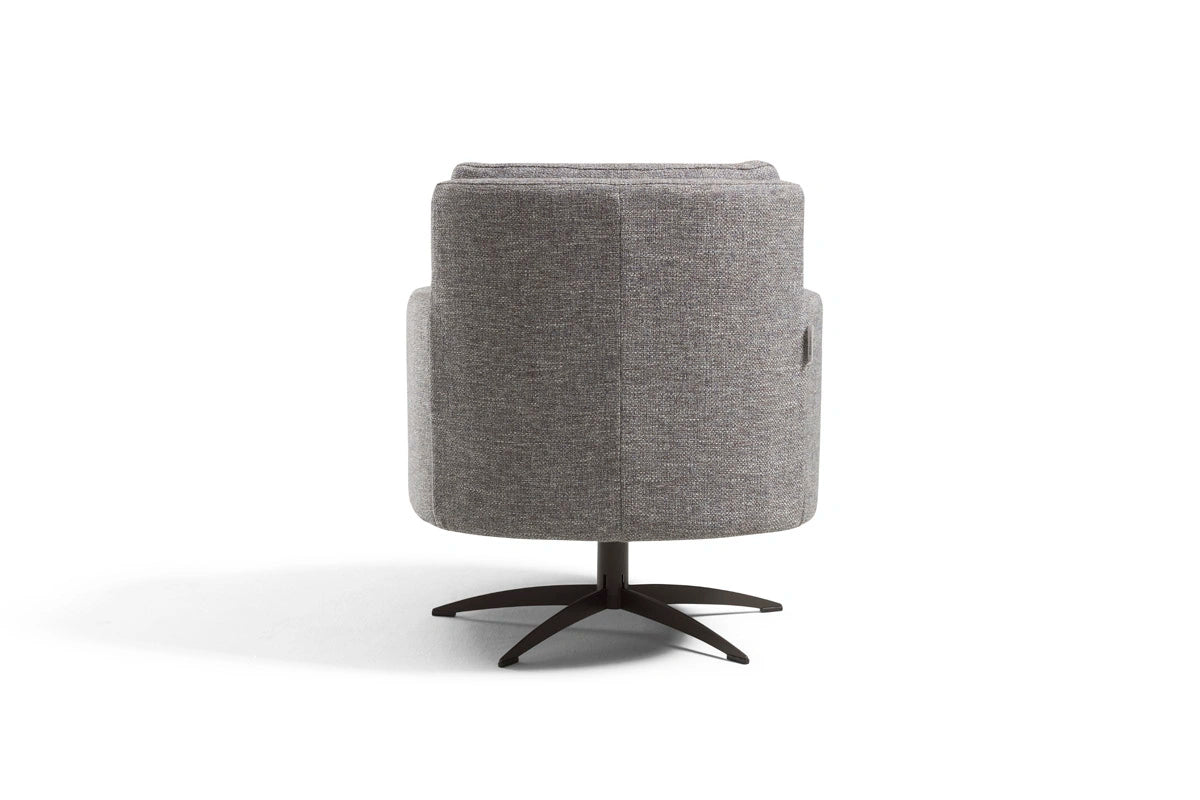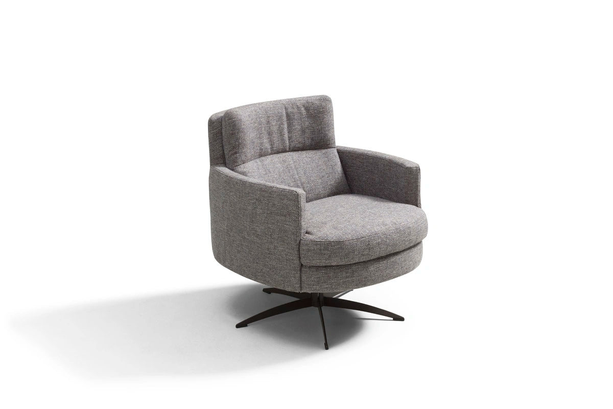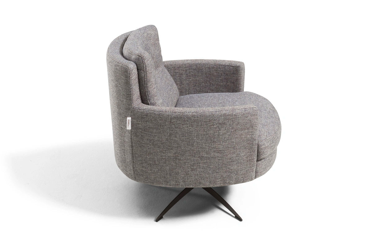 Thea is a sleek, modern swivel armchair featuring a sturdy metal rotating base for smooth 360° movement. Part of an exclusive collection that melds vintage charm with contemporary style, Thea evokes a warm retro atmosphere while fitting seamlessly into modern interiors.