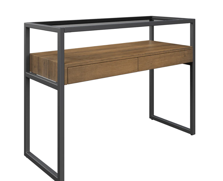 Console table. Size W 100 x D 40 x H 75 cm. Glass top with metal frame and drawer unit. Finish: Wood look frame with glass top.